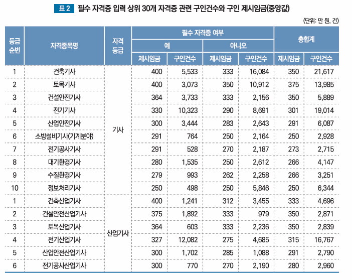 필수자격을 요구하는 공고에서 제시하는 임금(중앙값)을 분석한 결과 건축기사, 토목기사, 건축산업기사가 400만원으로 가장 높았다. 건축산업기사의 경우 필수자격이 아닌 공고와 비교해봤을때 편차가 월 88만원에 달해 가장 큰 격차를 나타냈다.